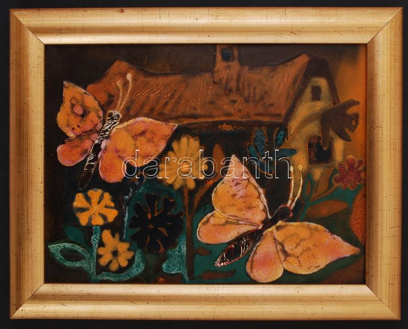 Leírás: Kaposváriné Mihályi Mária: Pillangó a háznál. Tűzzománc, fém lemez, jelzett, keretben, 17×22 cm
