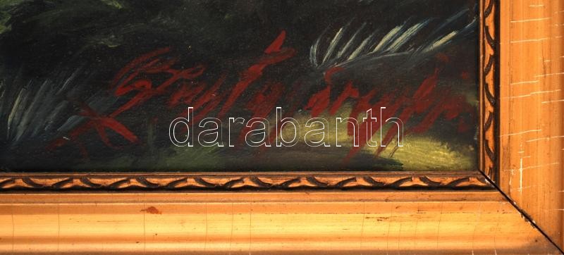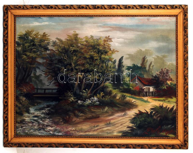 Leírás: Olvashatatlan jelzéssel: Faluszéli ház. Olaj, vászon, antik keretben, 60×80 cm