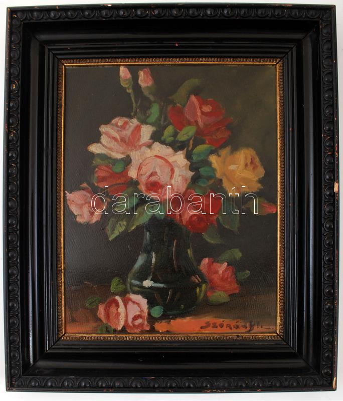 Leírás: Szórády jelzéssel: Virágcsendélet. Olaj, karton, sérült antik keretben, 33×23 cm