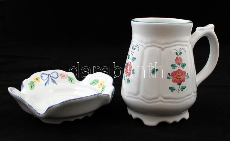 Virágmotívumos festett bögre, kézzel festett, jelzett, kis kopásnyomokkal, felületi hajszálrepedésekkel, d: 8,5 cm + Virágmotívumos hamutartó, kézzel festett, jelzett, kis kopásnyomokkal, felületi hajszálrepedésekkel, d: 15,5 cm