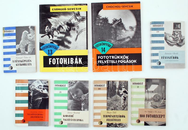 8 db fotóművészeti könyv: Csörgeő Tibor, Sevcsik Jenő: Fotohibák. Bp., 1967, Műszaki Könyvkiadó (Fotokönyvtár 13.). Papírkötésben, papír védőborítóval, jó állapotban.; Chochol Károly, Sevcsik Jenő: Fototrükkök, felvételi fogások. Bp., 1971, Műszaki Könyvkiadó (Fotokönyvtár 14.). Papírkötésben, papír védőborítóval, jó állapotban.; a "Fotosorozat" c. könyvsorozat 2., 7., 10., 19. 28. és 35. kötete: Polster Alfréd, Lentz Sándor: 100 fotorecept. Bp., 1957, Műszaki Könyvkiadó. Kicsit kopott papírkötésben, jó állapotban.; Csörgeő Tibor: A fényképezés gyakorlata. Bp., 1960, Műszaki Könyvkiadó. Papírkötésben, jó állapotban; Bence Pál: Természetjárók felvételei. Bp., 1957, Műszaki Könyvkiadó. Papírkötésben, jó állapotban.; Szimán Oszkár, Radó Aurél: Fényszűrők (színszűrők). Bp., 1963, Műszaki Könyvkiadó. Papírkötésben, jó állapotban.; Járai Rudolf: Korszerű nagyítástechnika. Bp., 1966, Műszaki Könyvkiadó. Papírkötésben, jó állapotban.; Szemerédy Zoltán: Negatívtechnika amatőröknek. Bp., 1973, Műszaki Könyvkiadó. Papírkötésben, jó állapotban.