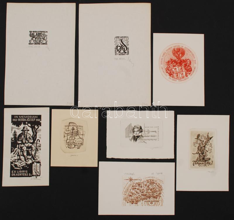 Leírás: 1967-1980 Ex libris gyűjtemény, fa, linó, acél és réz metszet: Gál, Kékesi, Nagy, Tempinszky, Vertel, 8db ebből 7 jelzett, különböző méretben