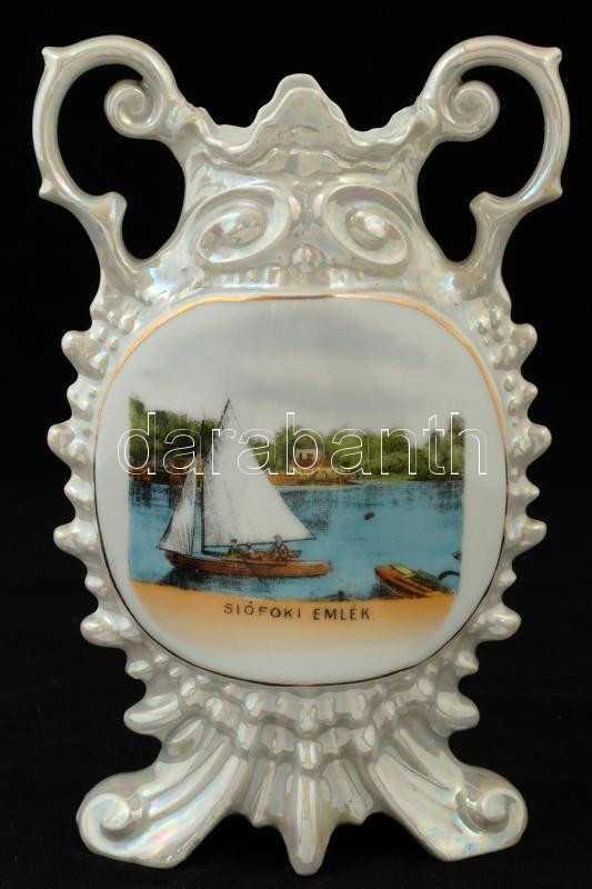 Leírás: Olvashatatlan jelzéssel Siófoki Emlék, porcelán váza, matricás, hibátlan, 20x13cm