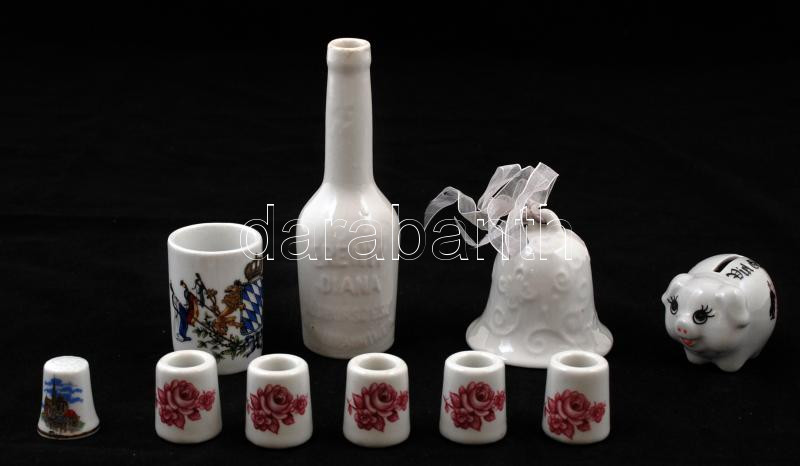 Vegyes porcelán tétel: címerrel díszített német porcelán kupica, matricás, jelzett, hibátlan, d: 4 cm + "Erényi "Diana" Sósborszesz Franzbranntwein" feliratú porcelán tárolóedényke, jelzés nélkül, apró kopásnyomokkal, m: 13 cm + 5 db kisméretű virágmintás német fogpiszkálótartó, matricás, jelzett, nagyon apró kopásnyomokkal, d: 2 cm + Dijont ábrázoló porcelán gyűszű, matricás, jelzett, hibátlan, m: 2,5 cm + "Viel Glück" feliratú, kéményseprővel és egyéb vidám motívumokkal díszített, malacot formázó porcelán persely, jelzés nélkül, kis lekopásokkal, m: 4,5 cm + díszes porcelán harang, jelzés nélkül, kis kopásnyomokkal, m: 6 cm