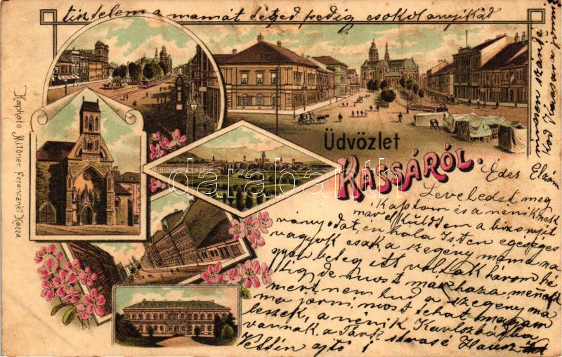Leírás: Kassa, Fő tér, piac, villamos; kapható Mildner Ferencznél / main square, market, tram, floral Art Nouveau litho (ázott sarok / wet corner)