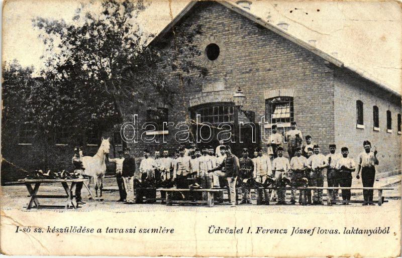 Leírás: Budapest VIII. (?) Ferenc József Lovas Laktanya, I-ső sz. készülődése a tavaszi szemlére (fa)