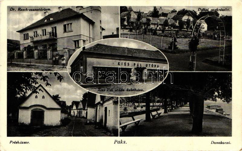 Paks, Kiss Pál utóda üzletház, Dr Resch szanatórium, présházsor, Duna ... https://www.darabanth.com/hu/234-Gyorsarveres/234.0/Kepeslapok/Magyarorszag~5/Paks-Kiss-Pal-utoda-uzlethaz-Dr-Resch-szanatorium-preshazsor-Duna-korzo-es-park-EK~II1070924