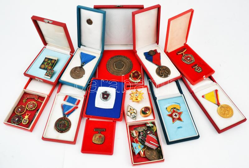 Doboznyi vegyes magyar kitüntetés, jelvény és kitűző, főleg a szocialista időszakból, több tokban, közte "Véradásért", "A Haza, A Nép Hűséges Szolgálatáért", "Díszszemle 1960" T:vegyes