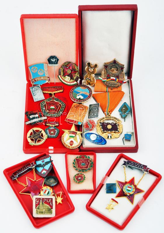 Leírás: Kis doboznyi vegyes magyar és külföldi kitüntetés, jelvény és kitűző, főleg a szocialista időszakból T:vegyes