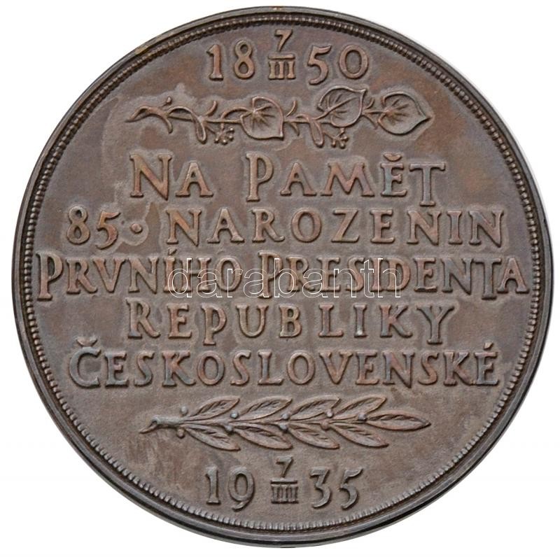 Csehszlovákia 1935. "Tomas G. Masaryk elnök 85. születésnapja" Ag emlékérem sérült eredeti tokban, peremén jelzett. Szign.:O. Spaniel (53,05g/0.987/50mm) T:2