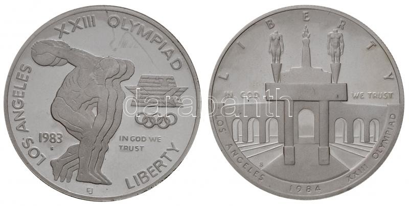 Amerikai Egyesült Államok 1983S 1$ Ag + 1984S 1$ Ag "XXIII. Nyári Olimpia Los Angeles" eredeti bársony és papír dísztokban tanúsítványokkal T:PP karc, felületi karc