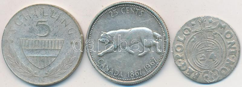 Vegyes: Lengyel Királyság 1625. 3P Ag "III. Zsigmond" + Ausztria 1966. 5Sch Ag + Kanada 1967. 25c Ag T:2,2-,3