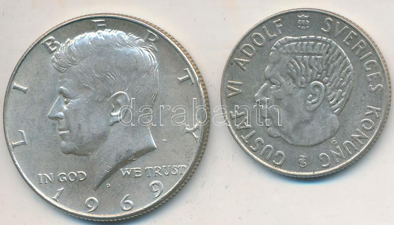 Vegyes: Svédország 1956TS 1Kr Ag "VI. Gusztáv" + Amerikai Egyesült Államok 1969D 1/2$ Ag "Kennedy" T:2,2-