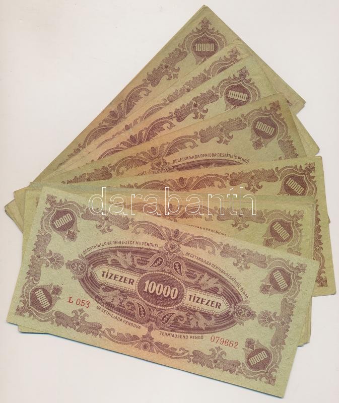 1946. 10.000P (15x) "MNB" bélyeggel T:II-,III https://www.darabanth.com/hu/234-Gyorsarveres/234.0/Numizmatika/Magyar-bankjegyek~30007/1946-10000P-15x-MNB-belyeggel-TII-III~II1033753