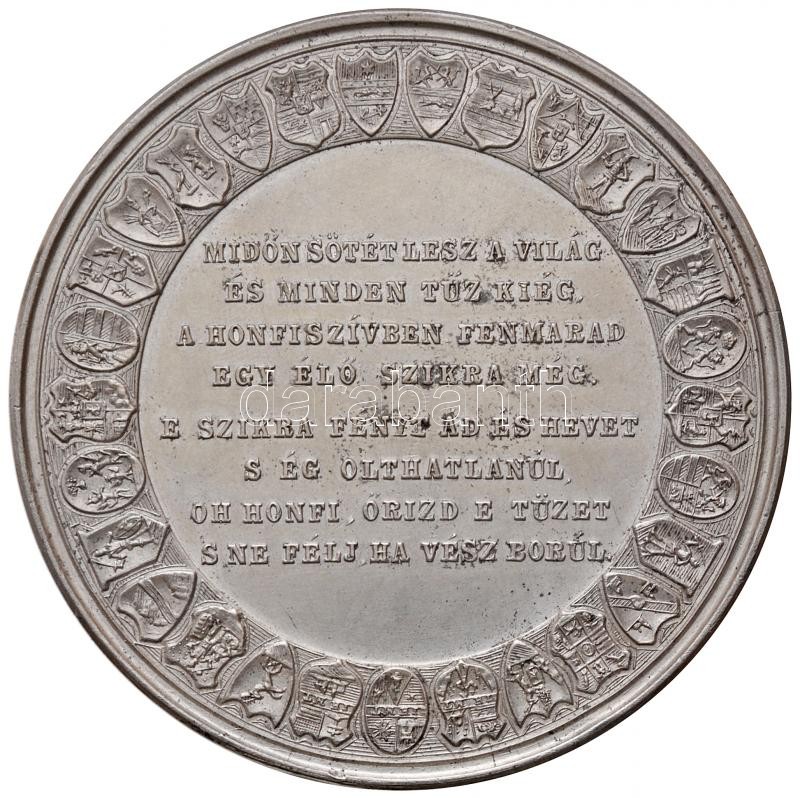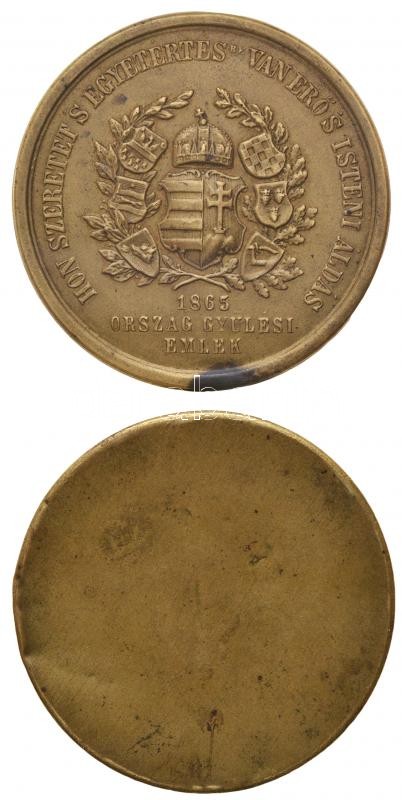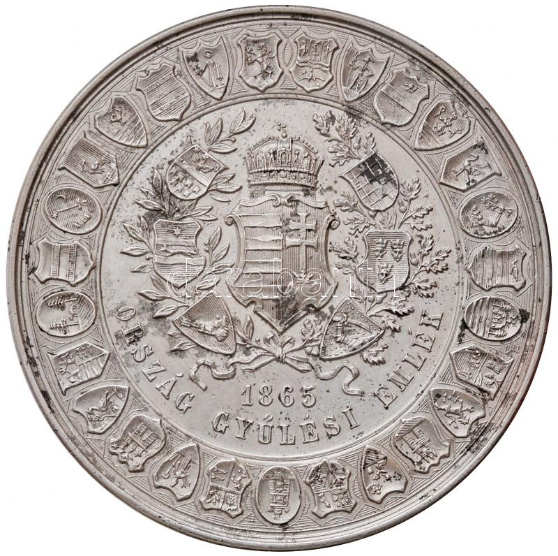 1865. "Országgyűlési Emlék" Sn emlékérem, peremen "E:M" gyártói jelzéssel. "1865 ORSZÁG GYŰLÉSI EMLÉK / MIDŐN SÖTÉT LESZ A VILÁG - ÉS MINDEN TŰZ KIÉG - A HONFISZÍVBEN FENMARAD EGY ÉLŐ SZIKRA MÉG. - E SZIKRA FÉNYT AD ÉS HEVET - S ÉG OLTHATATLANUL - OH HONFI, ŐRIZD E TÜZET - S NE FÉLJ, HA VÉSZ BORUL." (34,13g/50mm) + két részből álló Br lemezérem tok. "1865 ORSZÁG GYŰLÉSI EMLÉK - HON SZERETET 'S EGYETÉRTÉSbe VAN ERŐ 'S ISTENI ÁLDÁS" (51mm) T:2