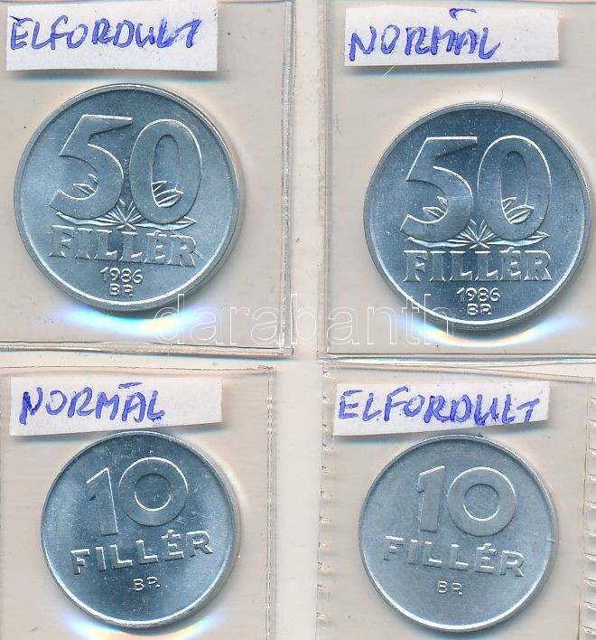 Leírás: 1986. 50f Al elő- és hátlap elfordult + 50f hibátlan + 1989. 10f Al elő- és hátlap elfordult + 10f hibátlan T:1-