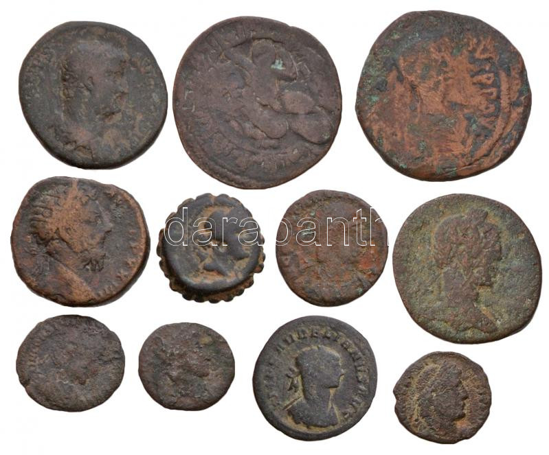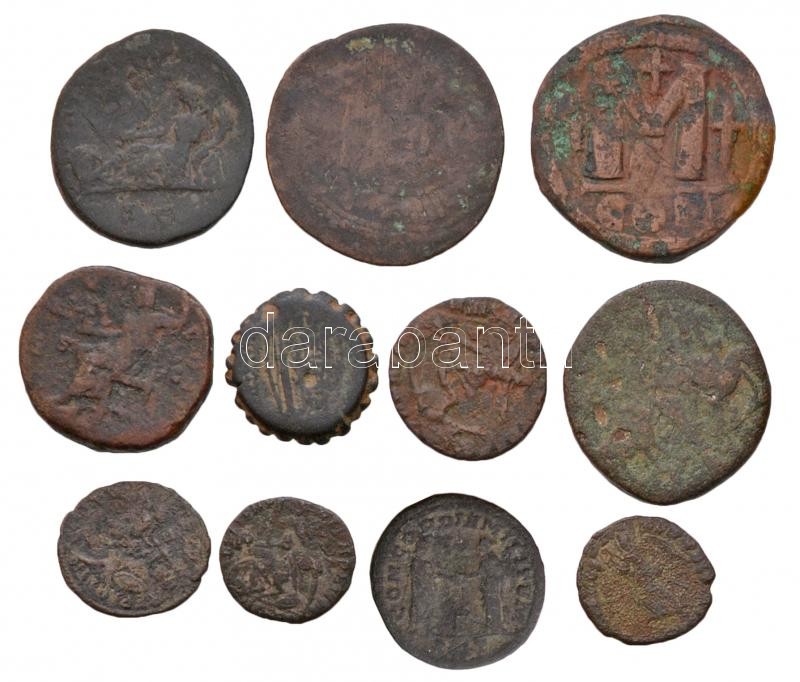 Leírás: 11db-os vegyes ókori és középkori réz-és bronzpénz tétel, főleg római, közte egy bizánci follis T:vegyes