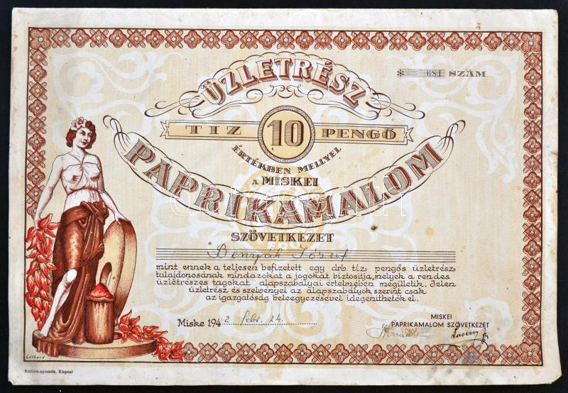 1942 Miske Paprikamalom Szövetkezet üzletrészjegy 10P-ről. T:III https://www.darabanth.com/hu/234-Gyorsarveres/234.0/Numizmatika/Reszvenyek-es-sorsjegyek~30005/1942-Miske-Paprikamalom-Szovetkezet-uzletreszjegy-10P-rol-TIII~II1067212