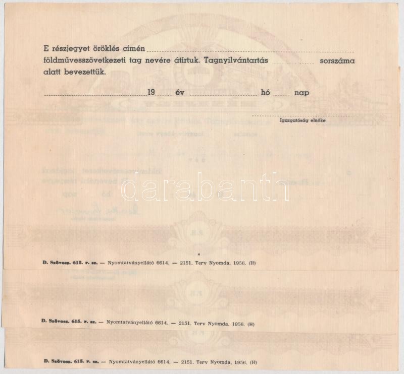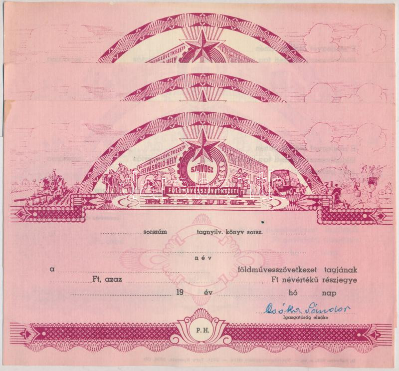Leírás: ~1970-1980. "SZÖVOSZ (Szövetkezetek Országos Szövetsége)" kitöltetlen földművesszövetkezeti részjegye (3x) T:I- hajtatlanok, fo.