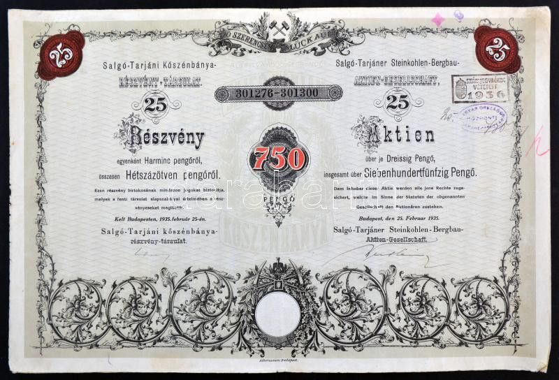 Leírás: Budapest 1935. "Salgó-Tarjáni Kőszénbánya Részvény-Társulat" 25 részvénye egyenként 30P-ről, összesen 750P-ről, szelvényekkel, bélyegzésekkel és szárazpecséttel T:III
