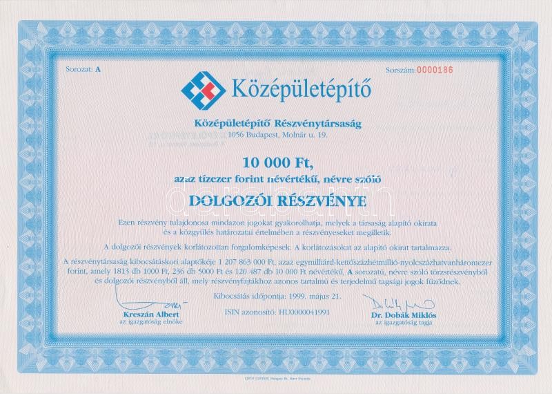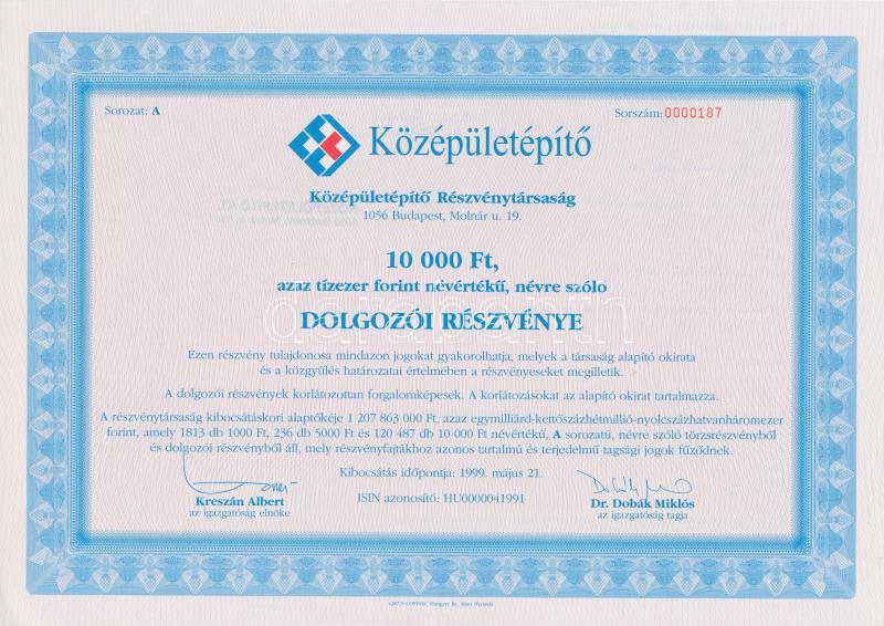 Leírás: Budapest 1999. "Középületépítő Részvénytársaság" dolgozói részvénye 10.000Ft-ról (2x) sorszámkövetők T:I