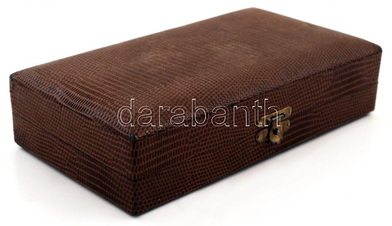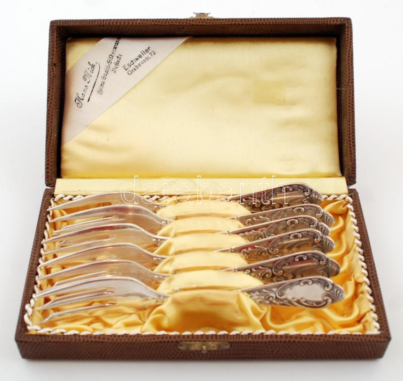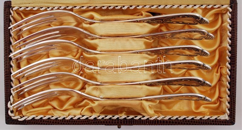 Leírás: Ezüstözött fém desszertes villa készlet, jelzett (Astra), eredeti dobozában,