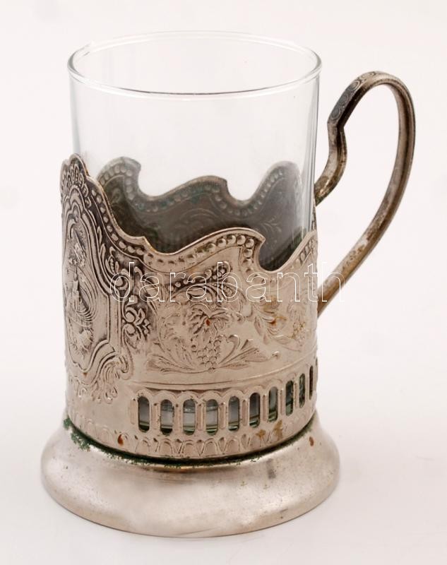 Leírás: Jelzett szovjet teapohár tartó, üveggel, m:10,5 cm
