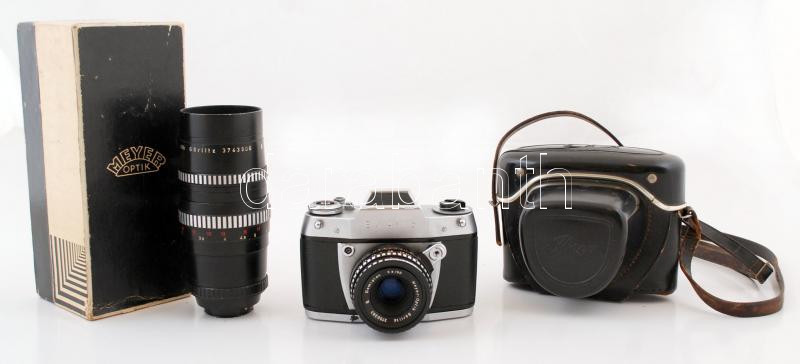 Leírás: EXA IIb Jhagee márkájú fényképezőgép saját tokjában + hozzá való Meyer Optik márkájú objektív, saját dobozában