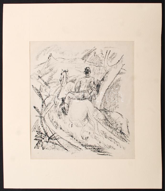 Leírás: Márffy Ödön (1878-1959): Lóháton, litográfia, papír, jelzés nélkül, paszpartuban, 20,5×18 cm
