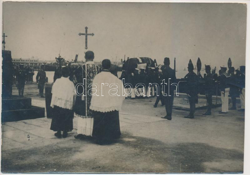 Leírás: 1914 A szarajevói merénylet, a trónörökös, Ferenc Ferdinánd és feleségének holttestét Triesztben a partra szállítják, hátoldalon feliratozva, 16x11 cm