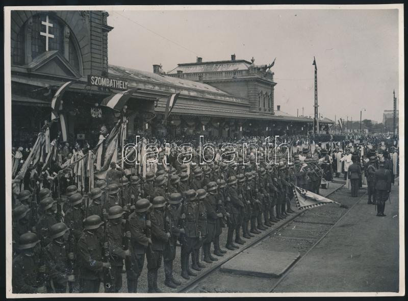 Leírás: 1938 Szombathely, Koronaőrök és katonák várják az Aranyvonatot a vasútállomáson, 24x17 cm