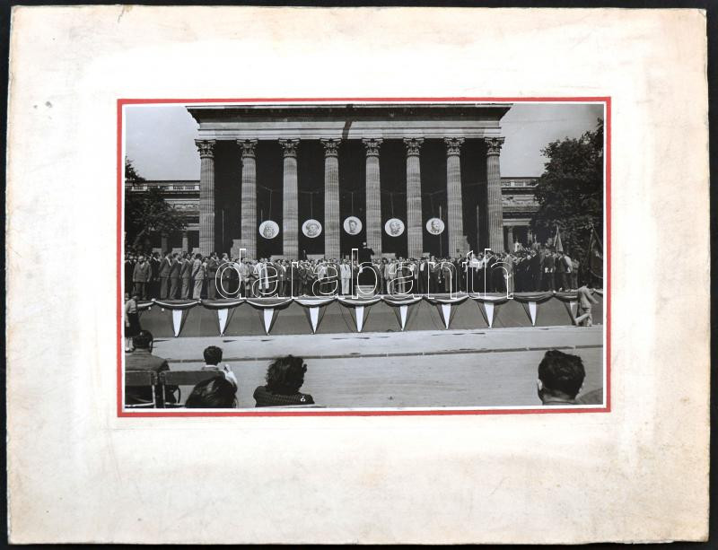 Leírás: 1948 Budapest Hősök tere ünnepség a Szabadságharc 100. évfordulójára. Szt István, Bem, Petőfi, Kossuth és Rákosi képe alatt. 24x18 cm keretben