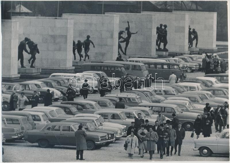 Leírás: 1963 Budapest, parkoló gépkocsik a Népstadionnál, feliratozott sajtófotó, 13x18 cm