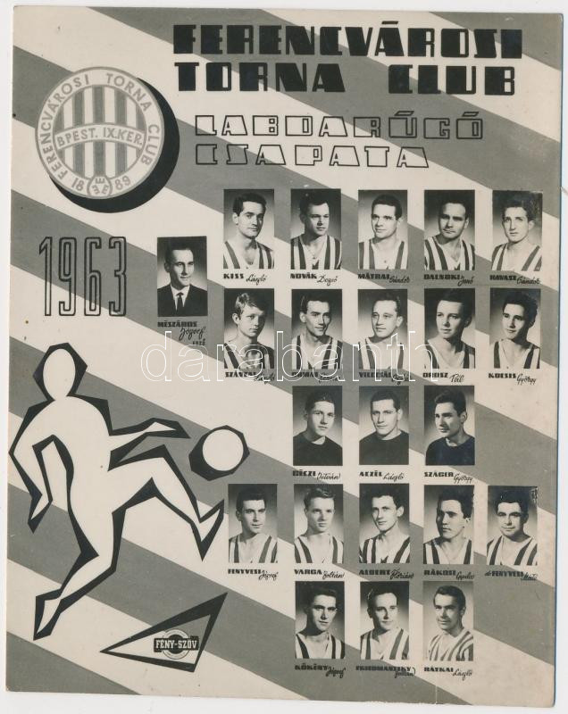 Leírás: 1963 Ferencvárosi Torna Club labdarúgó csapatának tablófotója, 9x11 cm