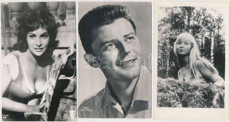 Leírás: Vegyes színész fotók: Gina Lollobrigida, Sam Levin, Marina Vlady, 14x9cm