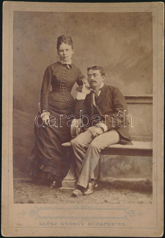 cca 1885 Házaspár Klösz György budapesti fényirdai műtermében, a felvétel a 26487-es nyilvántartási számot viseli, kabinet méretű, keményhátú fénykép, 16,5x11,5 cm