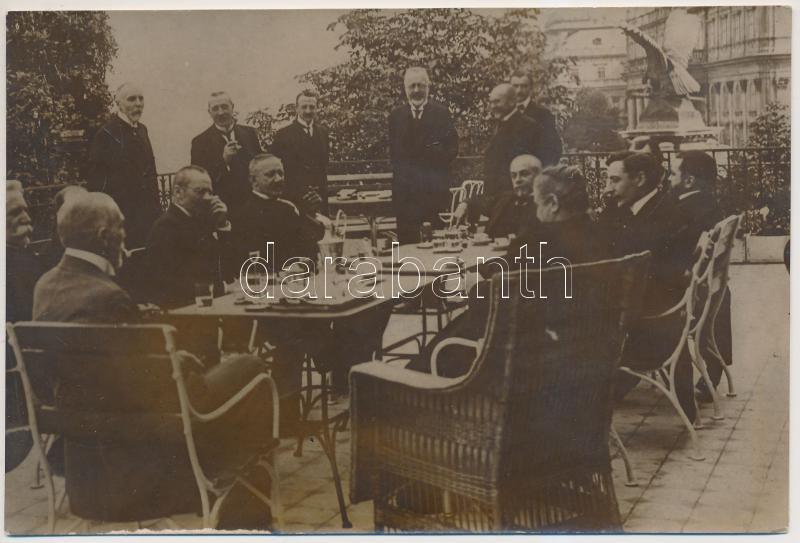 Leírás: cca 1913-1917 A kormány tagjai minisztertanács után gr. Tisza Istvánnál, a miniszterelnöki palota erkélyén, 16x11 cm