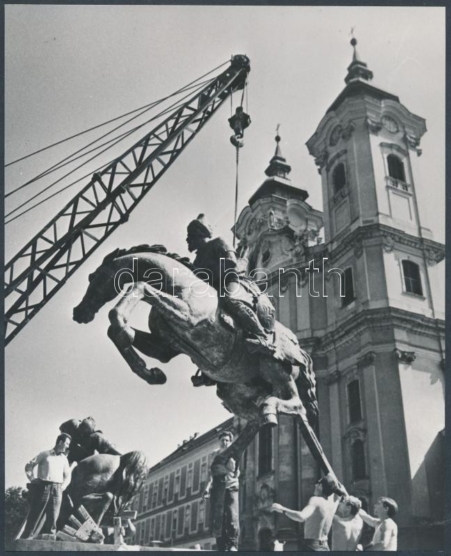 Leírás: cca 1967 Eger, Kisfaludy Strobl Zsigmond Végvári harcosok című szoborkompozíciójának felállítása, 21x17 cm