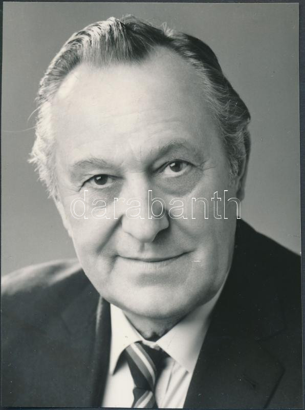 cca 1970 Bessenyei Ferenc (1919-2004) a Nemzet Színésze aláírt portréja a FŐFOTÓ színészalbumából, a kép hátoldalán az öntapadós fotóalbum hártyavékony ragasztós rétege, de az aláírás így is jól olvasható, 13,5x10 cm