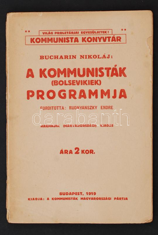 Bucharin Nikoláj:A kommunisták (bolseviek) programmja. Budapest, 1919,... https://www.darabanth.com/hu/235-Gyorsarveres/235.0/Festmeny-mutargy-papirregiseg-egyeb/Konyvek-Egyeb-ritkasagok~400033/Bucharin-NikolajA-kommunistak-bolseviek-programmja-Budapest-1919-Szocialista-Kommunista-Munk~II1072157