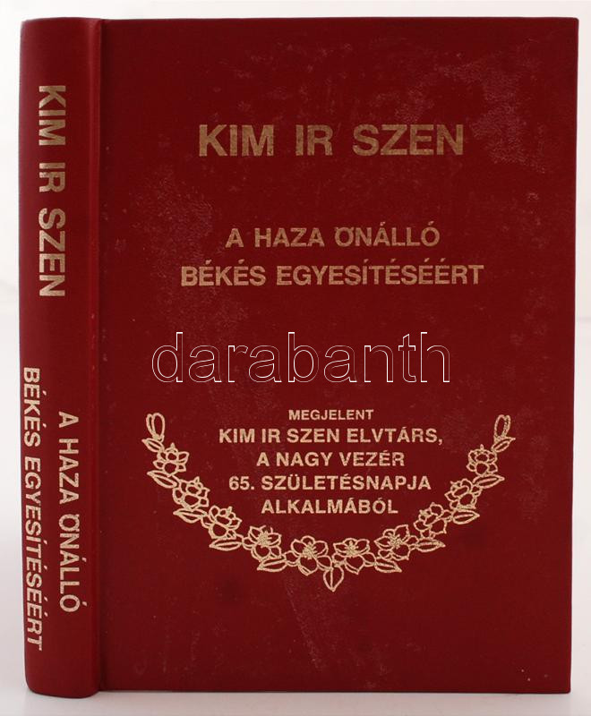 Kim Ir Szen, A haza önálló békés egyesítéséért. Megjelent Kim Ir Szen elvtárs, a nagy vezér 65. születésnapja alkalmából. Phenjan, Korea, 1977, Idegennyelvű Könyvkiadó. Kiadói aranyozott műbőr kötés, kissé piszkos, egyébként jó állapotban.