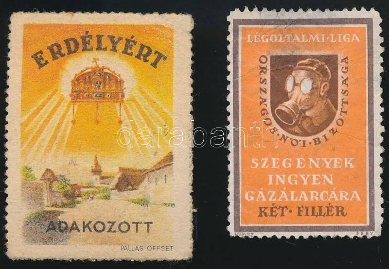 Leírás: A Légoltalmi Liga által a szegények ingyen gázálarcára kiadott 2 f, és Erdélyért jótékonysági bélyeg