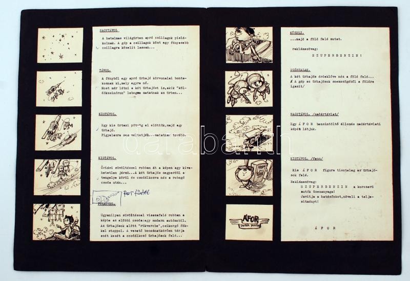 Leírás: 1966 ÁFOR szuperbenzin reklám Foky Ottó saját kézzel rajzolt forgatókönyve
