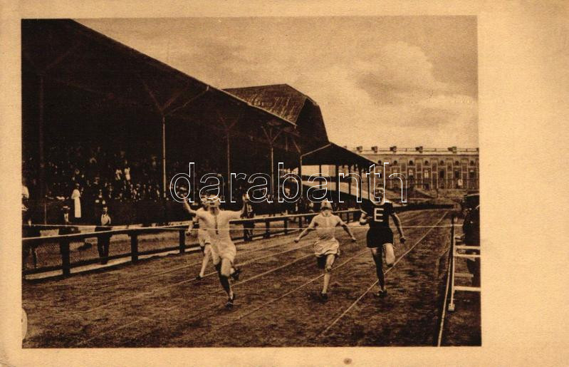 Leírás: 1913 K.A.O.E. verseny, Rákos győz 100 yardon; Weinreb, Rákos, Boros, Schubert; kiadja a Klasszikus Pillanatok Vállalat / Hungarian athlets, runners