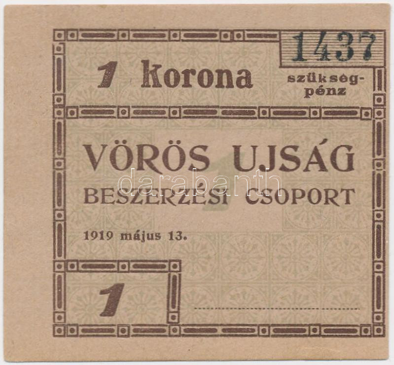 Budapest / Vörös Újság 1919. 1K T:I- kis szakadás https://www.darabanth.com/hu/235-Gyorsarveres/235.0/Numizmatika/Papir-es-fem-szuksegpenzek~24/Budapest-Voros-Ujsag-1919-1K-TI-kis-szakadas~II1075401