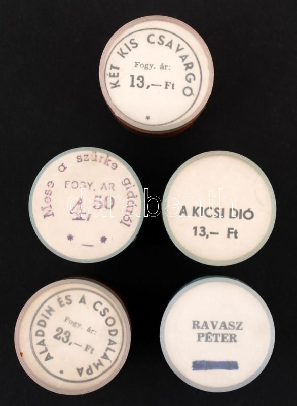 Leírás: Mesék és más történetek diafilmen: Két kis csavargó, Aladdin és a csodalámpa, Ravasz Péter, Mese a szürke gidáról, A kicsi dió, 5 db