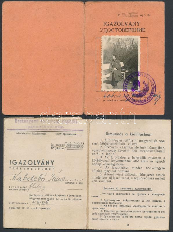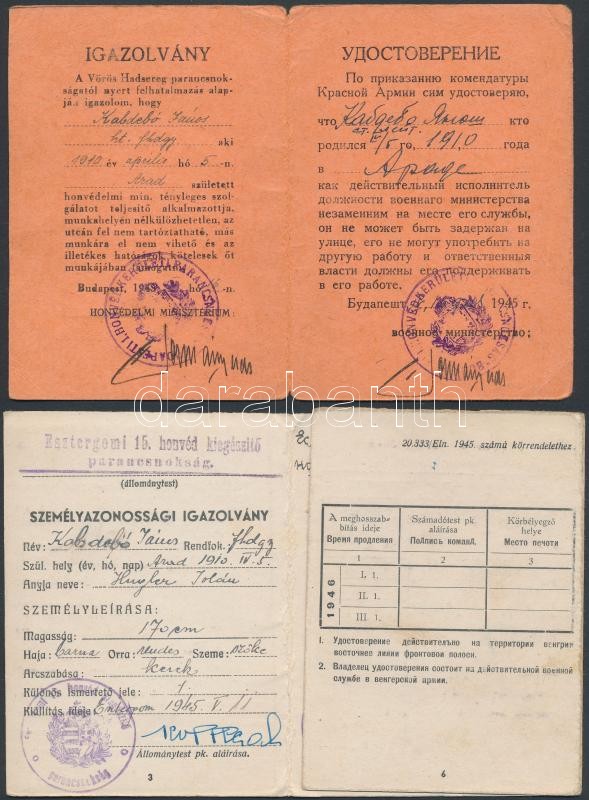 1945 Esztergomi 15. Honvéd kiegészítő parancsnokság igazolvány , + Budapesti honvédkerületi parancsnokság arcképes igazolvány mindkettő magyar és orosz nyelven
