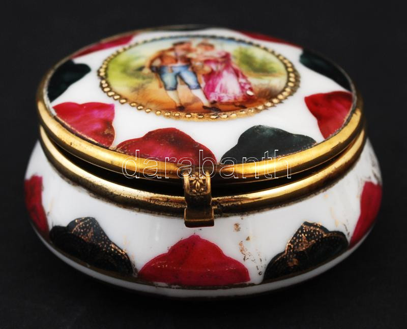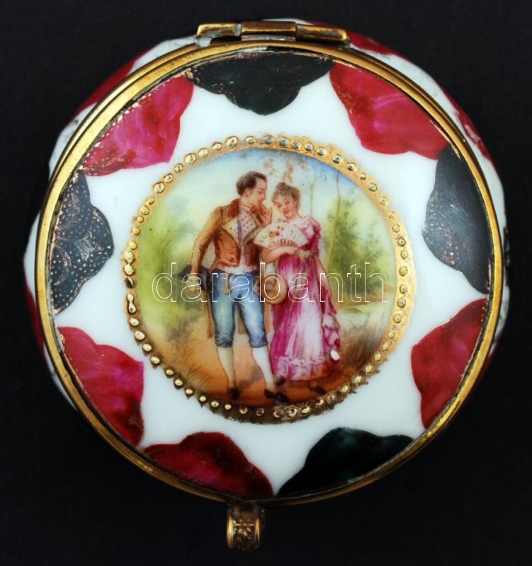 Leírás: Szerelmes párt ábrázoló német porcelán ékszertartó szelence. Hibátlan. / German porcelain d: 7 cm