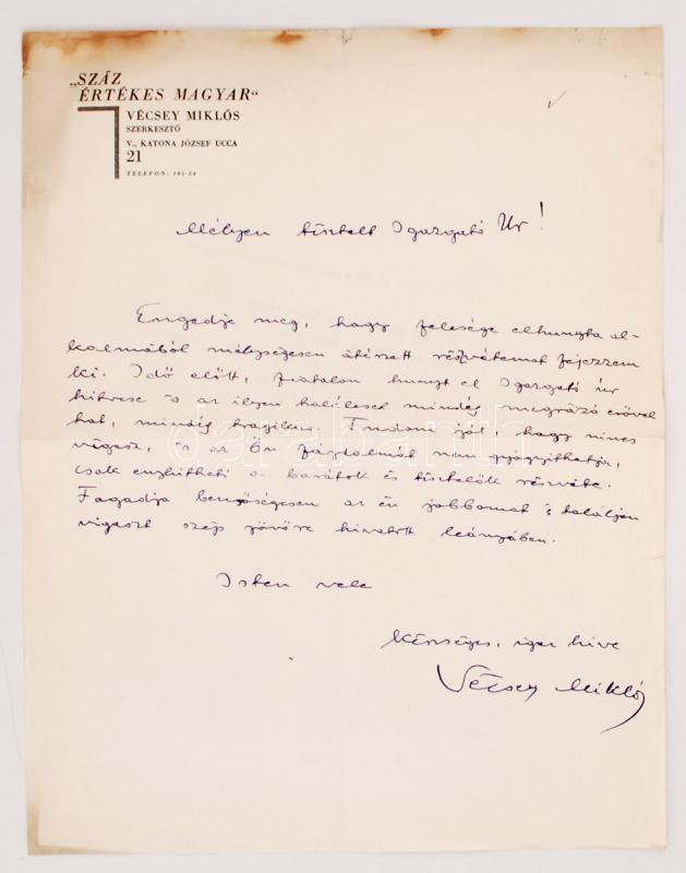 Leírás: Vécsey Miklós, a "Száz értékes magyar" szerkesztőjének saját kézzel írt levele aláírásával