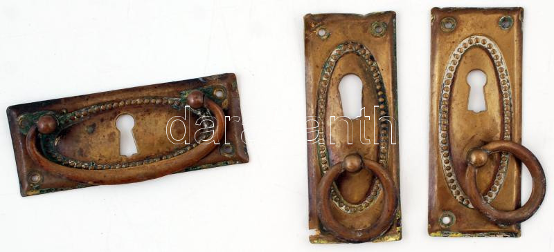 Leírás: 3 db antik réz bútorveret (1db fiók, 2 db szekrény), 8,5×3 cm